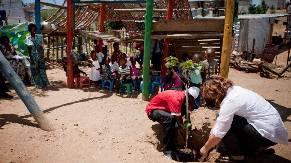 Skygge av brusbokser. Ni måneder etter at presidenten har lovet bedre boliger for de fattige, plantes et tre utenfor en liten barnehage i Katutura. To små gutter holder fast i den tynne stammen, mens den tyske ambassadøren og en ung kunstner graver et hull treet kan gro i. Det er en spesiell dag i barnehagen. De har nettopp fått et «leskur» bygget av gamle brusbokser, som sørger for en svalende skygge over mesteparten av lekeplassen.