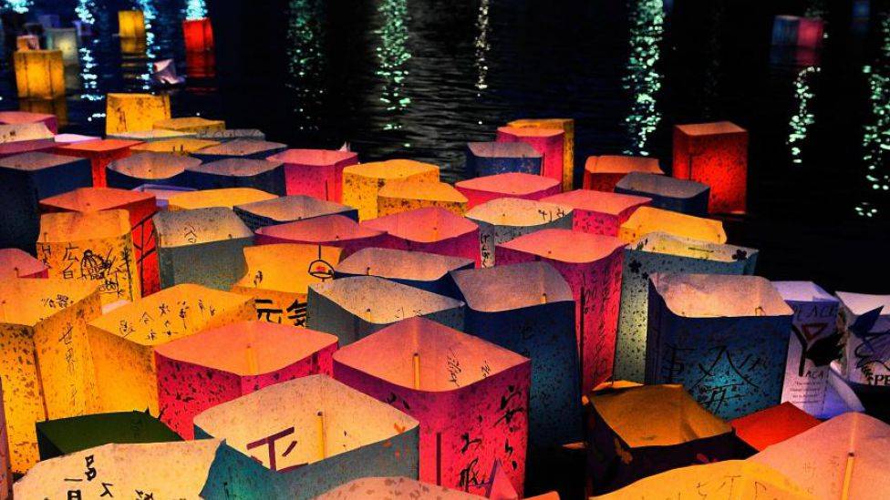 • Minnes ofre for atombombe Papirlykter flyter i elven Motoyasu foran Atombombedomen i Hiroshima i Japan 6. august 2011, for å minnes ofrene 66 år etter at verdens første atombombe ble detonert. Foto: TORU YAMANAKA, AFP/SCANPIX