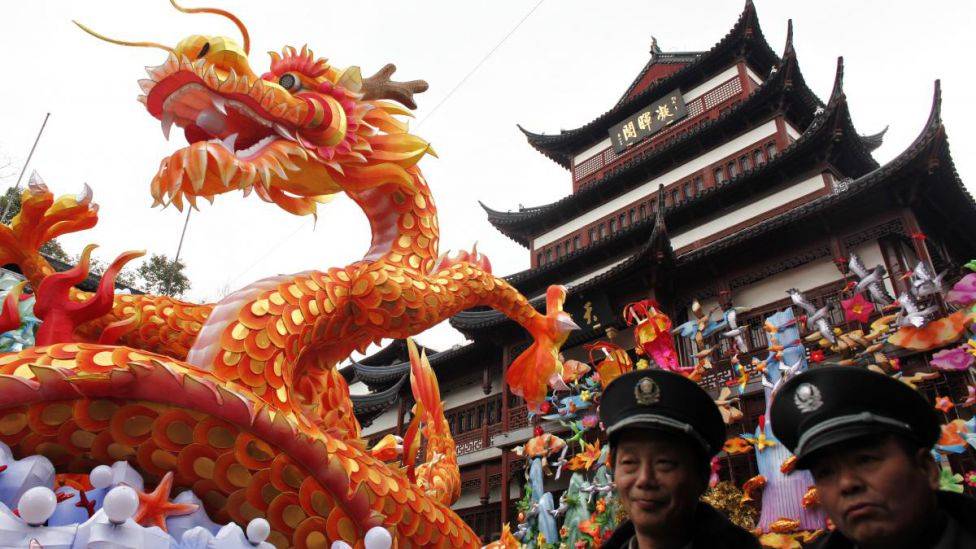 Feirer dragens år Sikkerhetsvakter går forbi en dragelanterne og andre kinesiske nyttårsdekorasjoneri Yuyuanhagen i Shanghai sentrum, 17. januar 2012. Den kinesiske dragen kan se fryktinngytende ut, men symboliserer makt og lykke. Foto: CARLOS BAR...