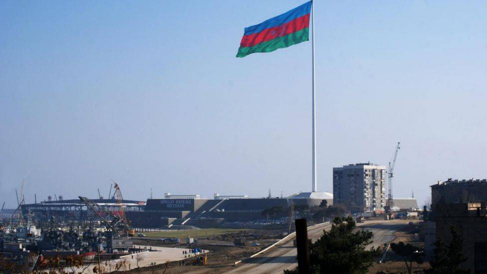 Milliardinvestering Et enormt aserbajdsjansk flagg vaier over den nye konsertarenaen til Eurovision-finalen i Baku.