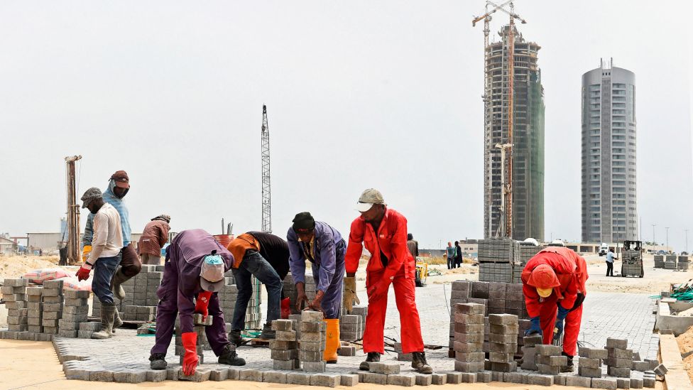 • Viktige arbeidsplasser Byggearbeidene i den nye bydelen Eko Atlantic utenfor Lagos er så smått i gang, men det går sakte fremover. Konjunkturnedgang i Nigeria har satt mange av byggeprosjektene på vent. Foto: PIUS UTOMI EKPEI, AFP/NTB SCANPIX
