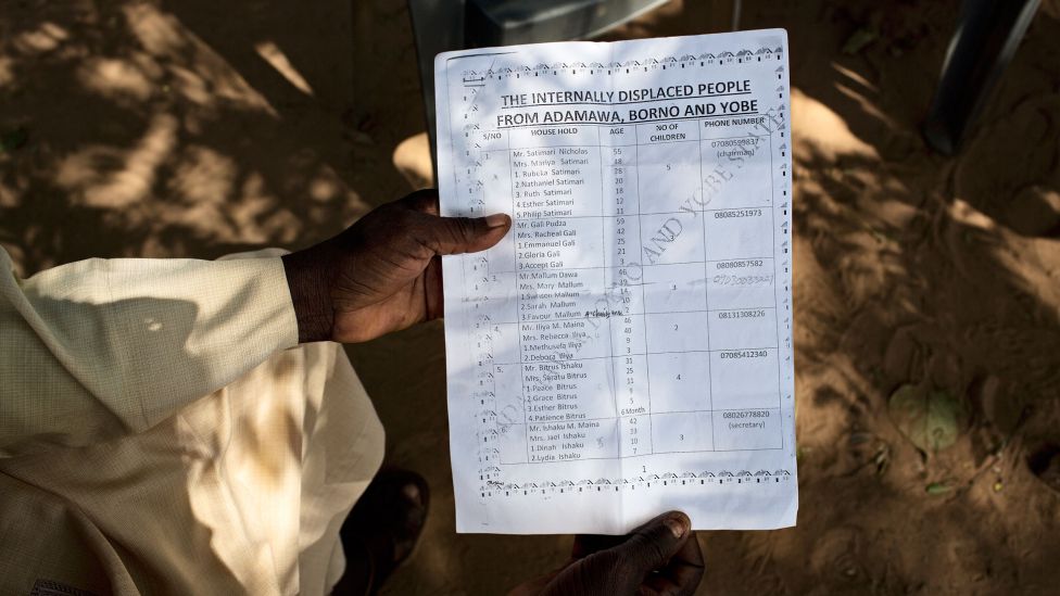 • Internt fordrevne Nicholas Satumari er leder for rundt 150 mennesker som har rømt fra ulike landsbyer nord i Nigeria for å unnslippe både Boko Haram og militærets herjinger. Han viser frem listen over alle som er registrert som internt fordrevne av myndighetene. Han sier de ikke får noen økonomisk eller medisinsk hjelp. De forlot alt de eide da de rømte. Foto: ANNE HÅSKOLL-HAUGEN