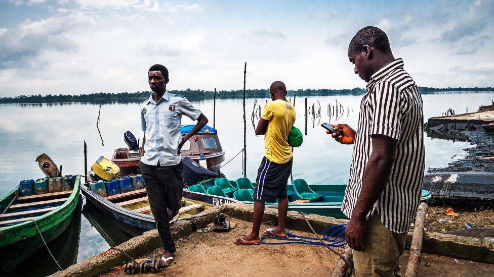 Etter noen runder med harde prisforhandlinger kjører vi utover på elven i en leid speedbåt. Båteieren, Saint Emmah Pee, sitter på toften og speider utover det stille elvevannet der store oljefalk ligger som regnbuefargede minnesmerker over gamle og nye miljøsynder. Lukten av tungolje følger oss over alt. Den lille sightseeingturen bringer oss forbi gamle oljeinstallasjoner som stikker opp av vannet. Ingen har tatt seg bryet med å fjerne de forvridde og delvis istykkerrustede metallkonstruksjonene. I en vik treffer vi Zemano og Grace. De to fiskerkvinnene er ute og prøver å finne skjell.