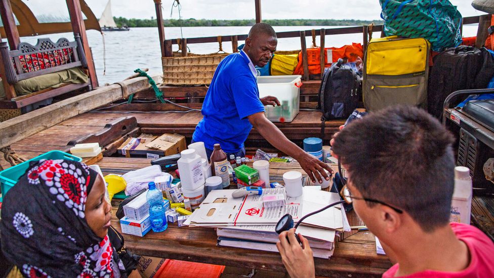 Fire timer til legen. I skyggen av et tre åpner Kalu en boks med vaksiner, og snart er et femtitall kvinner samlet for å vaksinere sine barn. I en forlatt bygning, som tidligere tilhørte det kenyanske forsvaret, legger tannlege Madina Mudeizi ut arbeidsutstyret i en tom vinduskarm. Hun setter på seg munnbeskyttelse og hilser den første pasienten velkommen til undersøkelse. I rommet ved siden av sitter lege Nassir Ali Shaban og tar imot pasienter for grunnleggende helsekontroll, og i andre hjørnet av lokalet er en støvete krok blitt til et apotek. Fra Kiangwe er det nesten fire timer med båt til nærmeste sykehus – en reise de færreste har råd til.