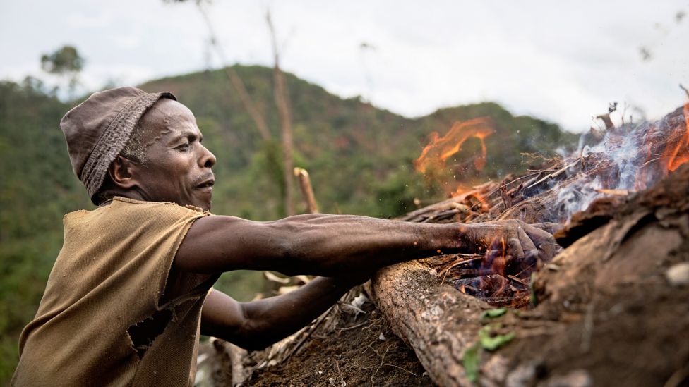 Ramanambero tenner fyr på noen tørre blader og tynne kvister. Når ilden har fått tak, trykker han den ned i et lite hull mot kullmilens indre, ned mot trestammene som skal forkulles.
