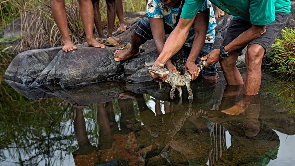 Engasjert – Da jeg først fanget en krokodille, ble jeg bitt, men jeg var fast bestemt på å vise at hendelsen skulle bli den siste. Jeg så opplevelsen som en prøve, og jeg oppmuntret meg selv til å fortsette helt til jeg ble vant til å omgås krokodiller. Jeg har utviklet en dyp forståelse for arten og deler opplevelsene mine med barna mine i håp om at de også skal bli opptatt av det biologiske mangfoldet som omgir oss, sier Bernard Tarun, ekspert på biologisk mangfold ved Mabuwaya Foundation. Her holder han en ung krokodille som snart skal slippes ut i naturen. Først må dyret måles, veies og merkes for å gjøre det lettere å overvåke den fremtidige vekstraten i naturen.