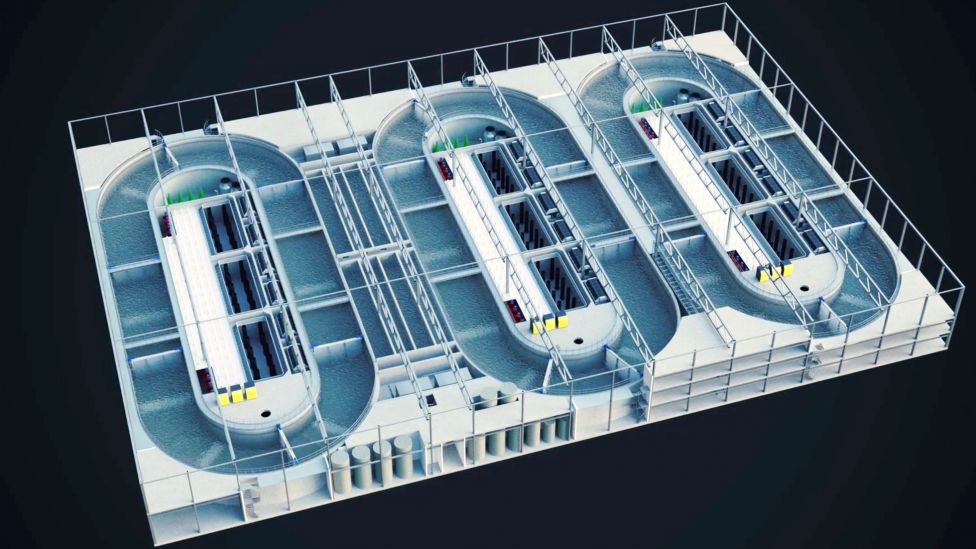 Selvrensende fisketanker Gründerne bak landbasert oppdrett mener de i langt større grad vil kunne ivareta fiskevelferd, biosikkerhet og logistikk enn ved oppdrett i åpne merder i fjordene. Det norske firmaet Nordic Aquafarms har investert store beløp i forskning og uttesting de siste par årene – basert på troen om at det er mulig å få til en miljøvennlig måte å øke produksjonen på. I desember setter selskapet i gang produksjon i Fredrikstad med en plan om å få frem slakteklar laks et år senere. Illustrasjon: Fra Nordic Aquafarms presentasjonsvideo, gjengitt med tillatelse.