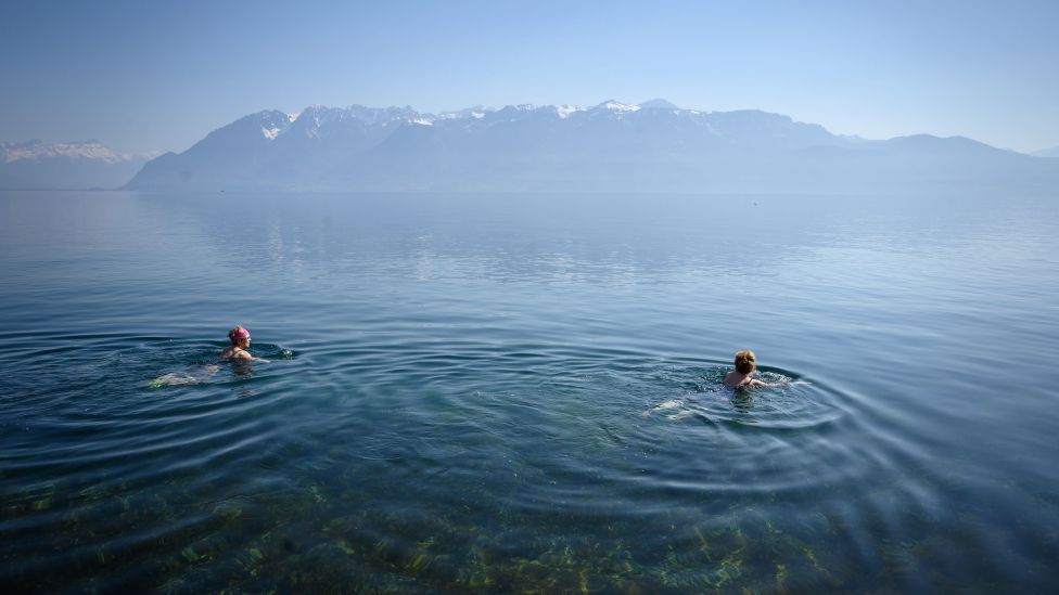 Ved Genfersjøen er det ikke bare svømmere som nyter det innbydende vannet: Folk leser, slapper av, tar seg en øl med venner, og barn hopper fra stein til stein.