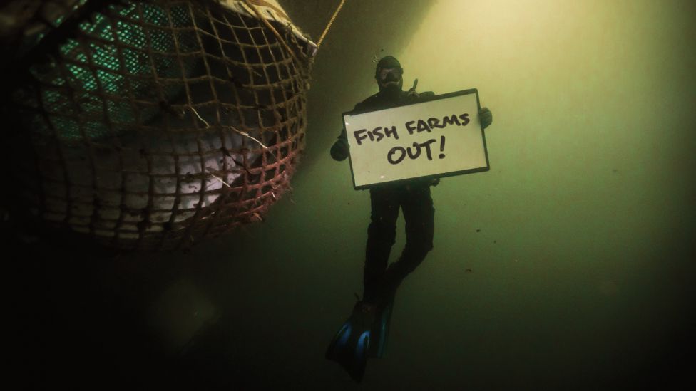 • Lokal motstand En dykker uttrykker sin mening om oppdrettsanlegg i Canada. Foto: Clayoquot Action