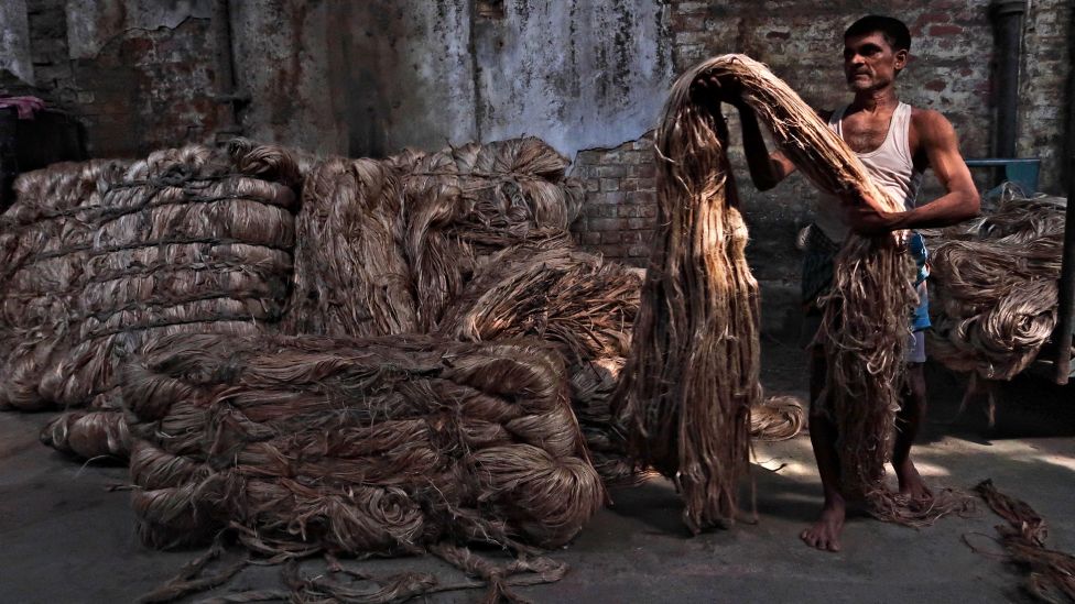 Varmt og vått. På andre siden av grensen som skiller Bangladesh fra India, i en gammel fabrikkbygning i Kolkata, står en mann kledd i det bengalske lange lendekledet lungi. Lyset som finner veien gjennom et vindu, lyser opp halve rommet som er flere meter under taket. Med raske bevegelser vikler han knippet av tykke gyllengrå fibre til lange nøster og kaster dem så i en raskt voksende haug på en tralle på gulvet.