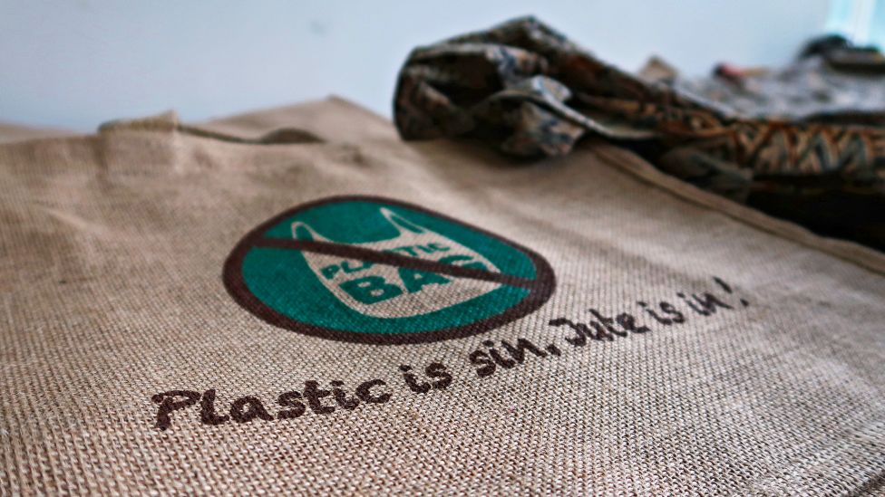 Dhaka, Bangladesh. Den gjennomsiktige posen er tynn og smidig – noe tykkere en den som er vanlig i butikken, men akkurat like lett. Den har to håndtak og plass til kanskje ett kilo appelsiner eller to. Men der slutter likhetene med plastposene. Denne posen er hverken laget av prosessert olje eller naturgass, men av jute.