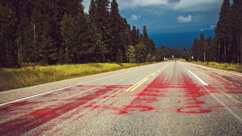 • Protest Da Kanahus Manuel ble arrestert utenfor Clearwater, malte tvillingsøsteren hennes veien rød, som et symbol på kvinner og barn som er blitt stjålet fra secwepemcene etter at den hvite mannen kom. Foto: MORTEN RISBERG