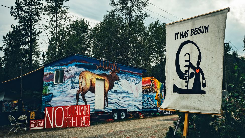 Protesthus langs utbyggingsruten. 500 km av den nye oljeledningen kommer til å gå gjennom det opprinnelige hjemlandet til Secwepemc-folket. En gruppe av dem, som kaller seg Tiny House Warriors, har kjempet en hard kamp for å hindre at oljeledningen skal bli bygget gjennom området de fortsatt anser seg selv som de rettmessige eierne av.
