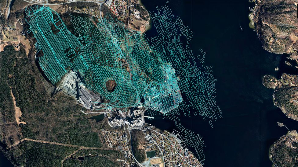 • Gruveganger Kartet over Dalen Gruver i Brevik viser beliggenheten til gruvene der det planlegges et giftdeponi. Her ligger flere hus bare 40–50 meter over gangenes tak. Foto: NORCEM