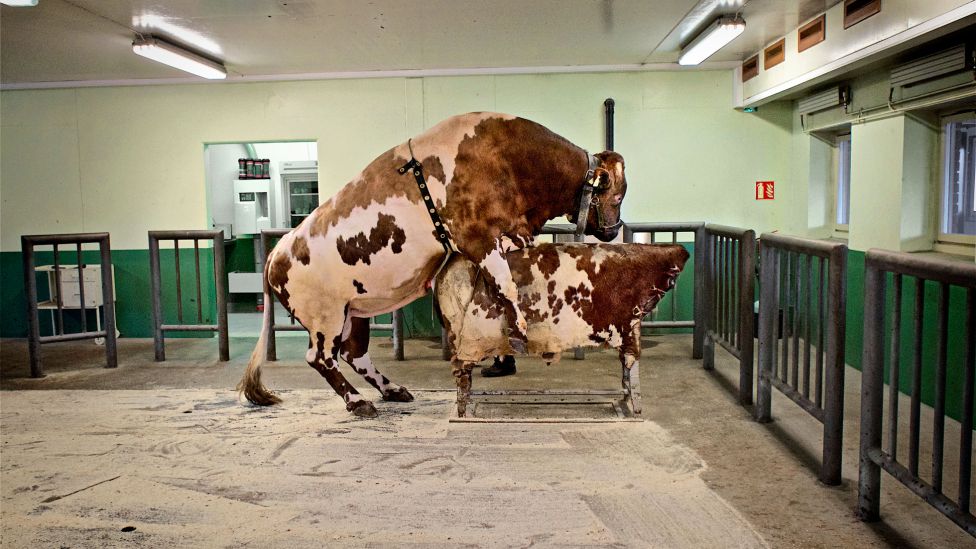 Sjenert superokse. Storoksen Enger leies inn i the «room of pleasure». Det er et stort rom med sagflis på gulvet og denne fantom-kua i hjørnet. Hun har ikke hode, men det bryr visst ikke oksene seg noe om. Langs kantene er det kraftige stålgjerder. De kan man gjemme seg bak, som tyrefekterne på spanske arenaer. For i gjerdet er det mann-høl.