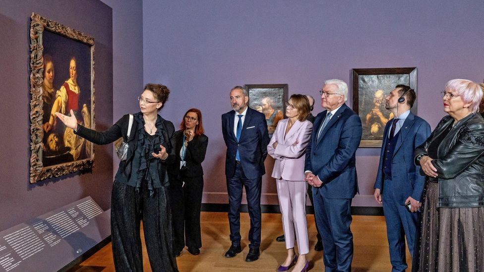 • Omvisning Dagmar Hirschfelder viser frem kunstverkene fra Ukraina under åpningen av utstillingen i Gemäldegalerie i Berlin. Fra 19. oktober til 22. mars 2026 vil de stilles ut i Kurpfälzisches museum i Heidelberg. Foto: Gemäldegalerie