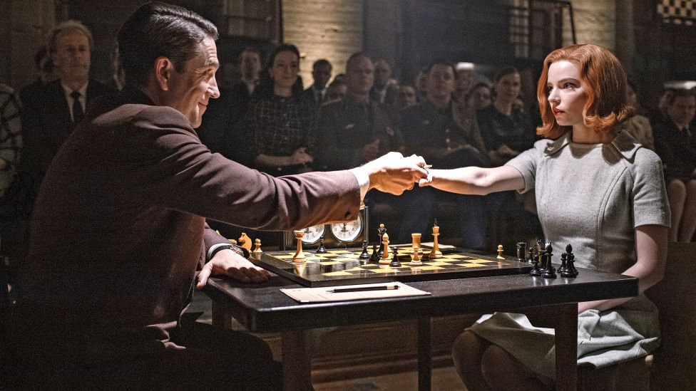 Scenen er en av de første i «The Queen’s Gambit», den kritikerroste Netflix-serien om en rødhåret jente som viser seg å ha et sjakktalent utenom det vanlige.