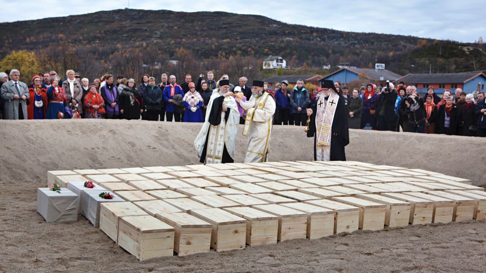 • Skoltesamer I 2011 ble levningene fra 94 skoltesamer brakt tilbake til Neiden i Øst-Finnmark og lagt i jorden ved det ortodokse kapellet. I 1915 hadde vitenskapsfolk åpnet gravene og tatt med seg skjelettene. Målet var gjennom forskning å dokumentere at samene tilhørte et mindreverdig folk. Foto: PER LARS TONSTAD