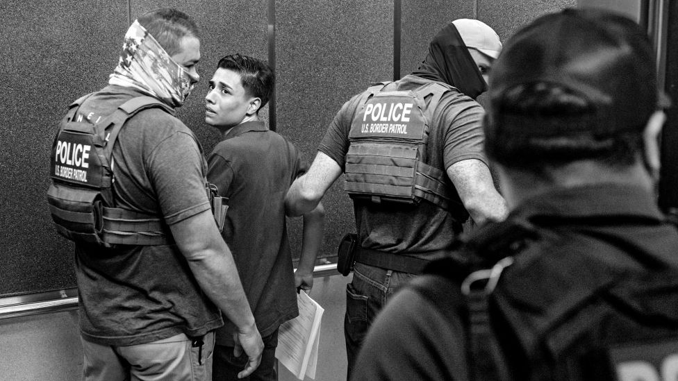 Overvåking Maskerte føderale agenter stiller seg utenfor høringssalene i innvandringsdomtolen for å identifisere de saksøkte når de forlater rettsmøtene. Immigranter som pliktoppfyllende møter opp til høring, risikerer umiddelbar fengsling i bakkant. I 2025 advarer borgerrettighetsgrupper om at bruken av tungt bevæpnede, maskerte agenter i sivile områder vitner om en dreining mot autoritære politimetoder. For familier og advokater som venter utenfor de lukkede dørene, er det umulig å forutse hvem som kommer ut til frihet og hvem som blir anholdt.