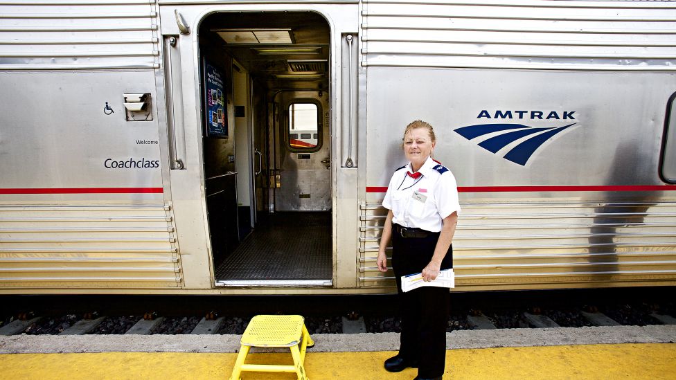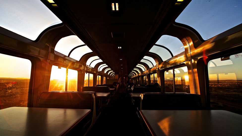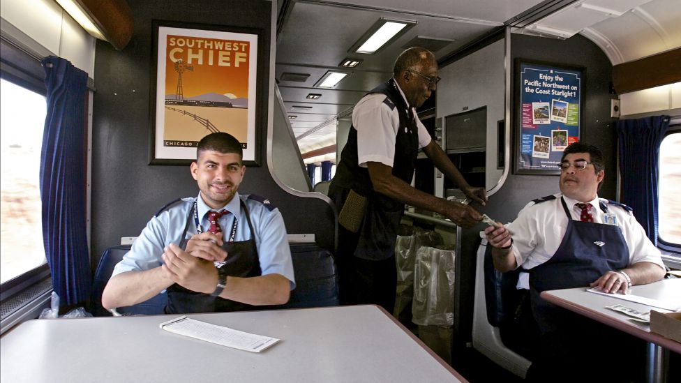 Livet ombord. Men det er like mye menneskene, som det historiske suset, som gjør toget til en særegen transportform. På langdistansetogene må du møte opp en time før avgang for å sjekke inn bagasjen, og i det to-etasjes togsettet som opererer vest for Chicago, velger du mellom sovekupé eller store, myke, nedleggbare seter. Toget har en panoramavogn med vinduer i taket for å nyte de spektakulære landskapene, en kiosk/bar og en spisevogn hvor du blir plassert med fremmede på de begrensede bordplassene. I panoramavognen trekker passasjerene sammen og deler bord og samtaler over kaffe av diskutabel kvalitet, eller ferdigblandet margarita for tre dollar i barens happy hour.
