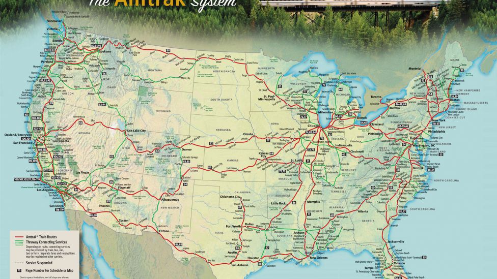 Denne ettermiddagen i april er det god plass på Southwest Chief, som skal ta oss 3630 kilometer gjennom ørkenen i California, Arizona og New Mexico, Rocky-fjellene i Colorado, og de veldige slettene i Kansas, Missouri, Iowa og Illinois, før vi som skal videre til New York, bytter tog i Chicago til Lake Shore Limited, som fortsetter de siste 1534 skogkledde kilometerne gjennom Indiana, Ohio, Pennsylvania og langs Hudson-elven ned til New York. De færreste skal imidlertid hele veien, bare 17 prosent av USAs togreiser er langdistanse. Og USA er et land med enorme distanser, som er ett av mange problemer for passasjertogene. Effektivitet er et annet: Vår gjennomsnittshastighet ligger et sted mellom 80 og 90 km/t, og vi blir stadig forbikjørt av trailere på den parallelle motorveien. Reisetiden på 72 timer fra vestkyst til østkyst er den samme som den var i 1930.