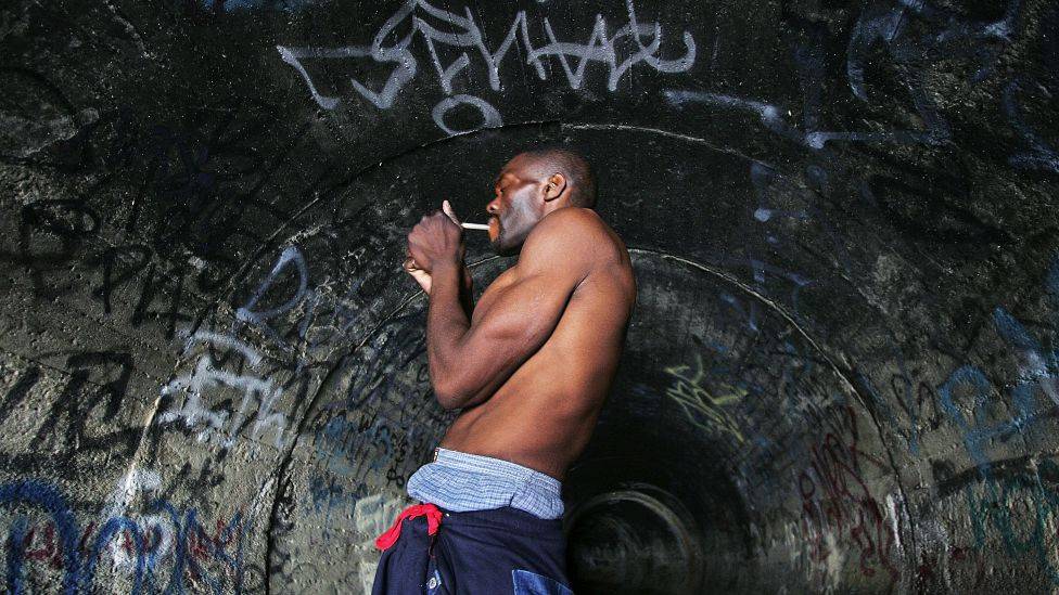 • Bruker like mye narkotika Undersøkelser viser at hvite amerikanere bruker mest heroin og kokain, mens svarte bruker noe mer crack kokain. En hjemløs mann røyker crack i et underjordisk bomberom i Los Angeles 18. januar 2006. Foto: DAVID MCNEW/GETTY IMAGES/AFP/NTB SCANPIX