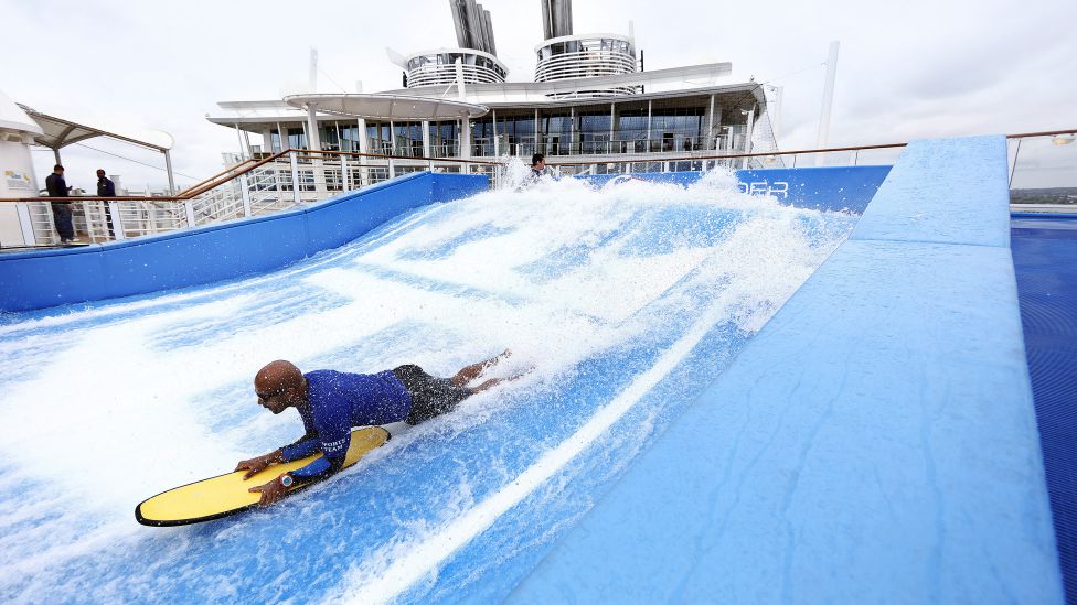 • Fristes til å bli ombord Bølgemaskinen om bord på Royal Caribbean Cruise Ltd.s «Harmony of the Sea» – verdens største cruiseskip – er én av attraksjonene som er ment å friste passasjerene til å bruke mer tid og legge igjen mer av reisebudsjettet om bord, fremfor i land på anløpsstedene.