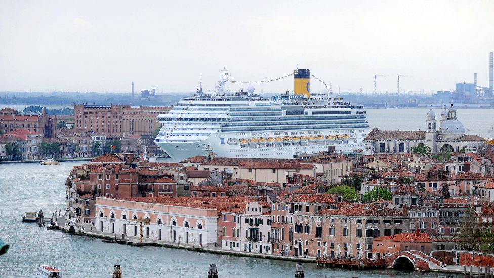 • Trangt I kanalbyen Venezia har det ført til slagsmål når byens myndigheter prøver å forsvare mangel på effektive tiltak overfor en turisme som i høysesong skaper fysiske ødeleggelser i de store skipenes kjølvann. Det bor cirka 60 000 fastboende omkring lagunens kanalsystem. Av de 23 millioner årlige besøkende, antas drøyt 2 millioner å være cruisepassasjerer. Her er det «Costa Fascinosa» som seiler inn foran Markusplassen.