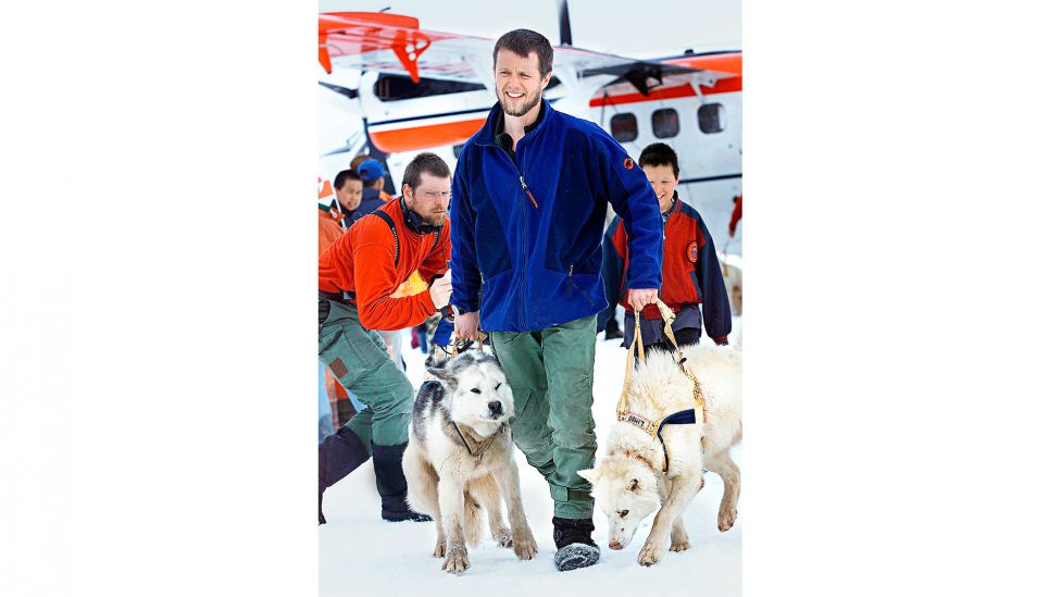 • Arktiske ambisjoner Kronprins Frederik av Danmark fører to sledehunder i Qaanaaq, nord på Grønland, etter en fire måneder lang arktisk ekspedisjon over 3500 kilometer gjennom Grønlands tøffeste områder i 2000. Foto: KELD NAVNTOFT, AP/NTB SCANPIX