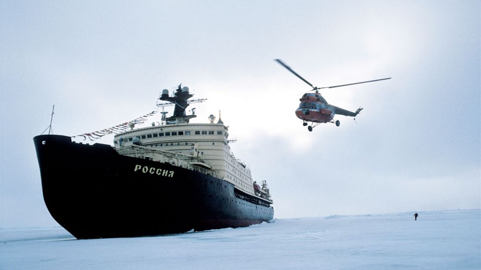 • Kjølig forhold Den atomdrevne isbryteren «Rossija» er utstyrt med eget helikopter som brukes til rekognosering for å sjekke om isen foran skipet er tynn nok til å bli brutt av skroget, her utenfor Murmansk. Skipet har to atomreaktorer: Én som driver skipet og én i reserve. Atomdrevne isbrytere kan bare operere i kaldt vann som kjøler ned reaktorene.