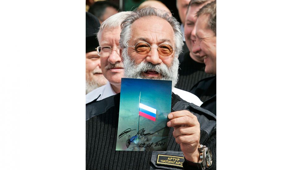 • Fremsatte sitt krav Ekspedisjonsleder Artur Tsjilingarov holder opp et bilde som viser det russiske flagget som ble plantet på havbunnen under Nordpolen i 2007. Foto: ALEXANDER NATRUSKIN/REUTERS/NTB SCANPIX