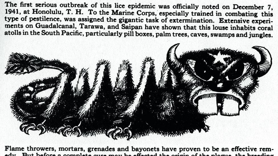 «Skadedyrbekjempelse.» I mars 1945 trykket de amerikanske marinestyrkenes organ Leatherneck Magazine en kort og formodentlig humoristisk artikkel om en parasitt ved navn Louseous japanicas. Den var illustrert med en tegning av en grotesk skapning med stereotypiske japanske ansiktstrekk. Teksten forteller oss at:
