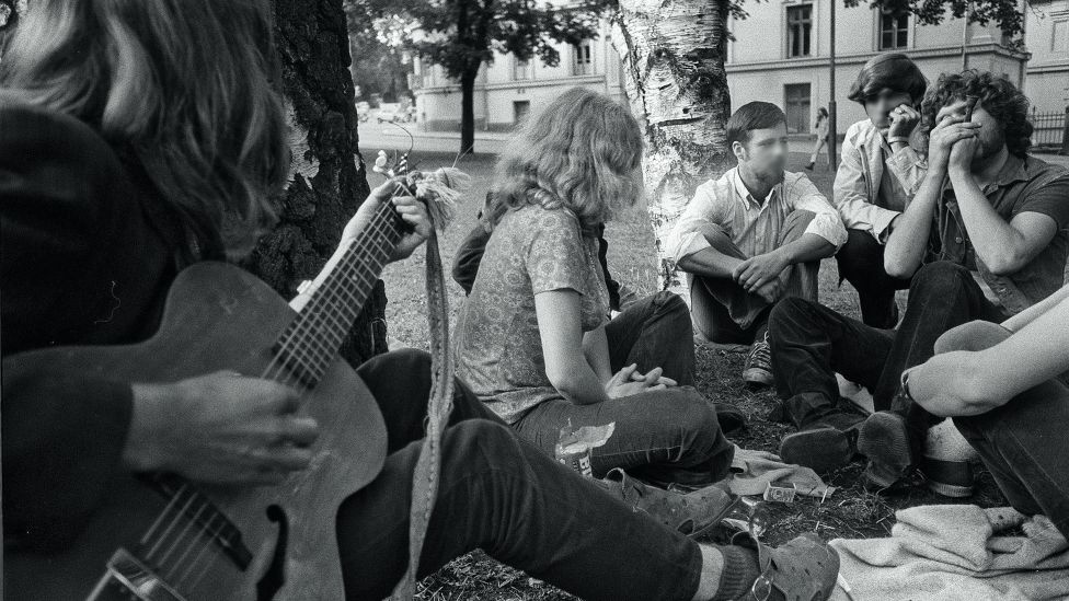 • Hippietid i Oslo Gitarspilling og hasjrøyking i Slottsparken, juni 1971. Foto: T. SKILLESTAD/NTB SCANPIX