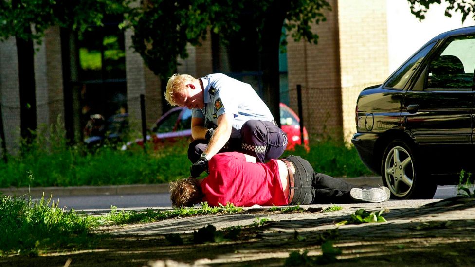 • Rus En politibetjent bistår en mann som har satt en overdose heroin i Oslo sentrum. Foto: THOMAS BJØRNFLATEN, NTB SCANPIX
