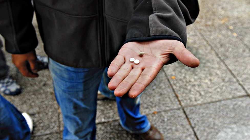 • Blandingsrus En mann viser frem hva han har kjøpt nederst i Karl Johans gate i Oslo: en «kvarting» med heroin og to «doble» – den ekstremt sterke sovemedisinen rohypnol. Foto: JON-ARE BERG-JACOBSEN, AFTENPOSTEN