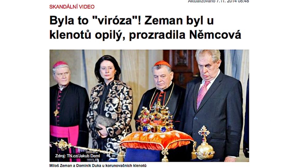 • I full offentlighet Flere ganger har Miloš Zeman vært tydelig påvirket av alkohol i offentligheten, sogar direktesendt på tv, som under en spesialfremvisning av de tsjekkiske kronjuvelene i mai 2013. Faksimile: TN.NOVA:CZ