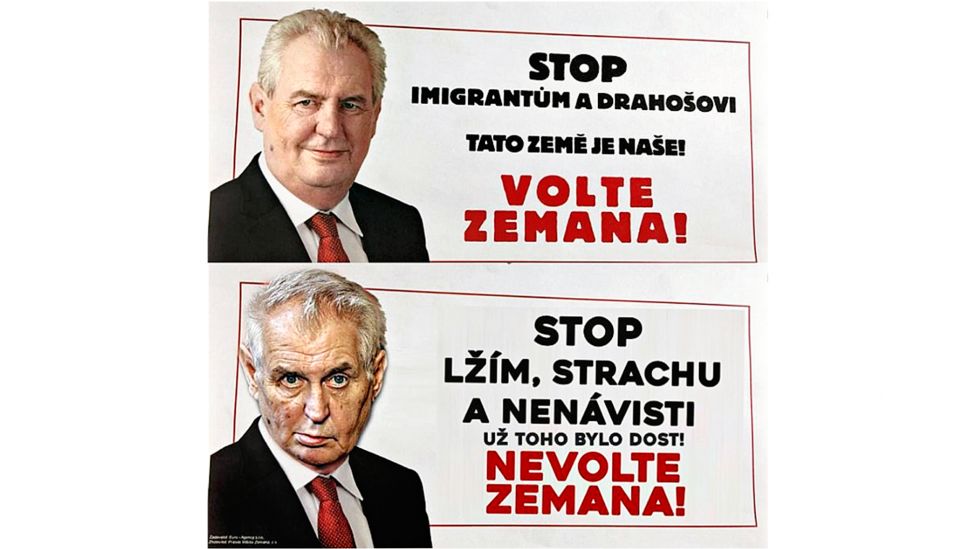 • Ufin sammensausing «Stopp immigrantene og Drahoš. Dette landet er vårt! Stem på Zeman!», står det på valgplakaten som grupperingen «Venner av Zeman» fikk trykket i stort opplag og hengt opp godt synlig på eksponerte steder over hele landet. Drahoš refererer til motkandidaten ved presidentvalget, jusprofessoren Jirí Drahos, som står langt fra Zeman i innvandringsspørsmålet. Det resulterte i en parodi på plakaten med følgende motbudskap: «Stopp løgner, frykt og hat! Nå har det vært nok. Ikke stem på Zeman!»