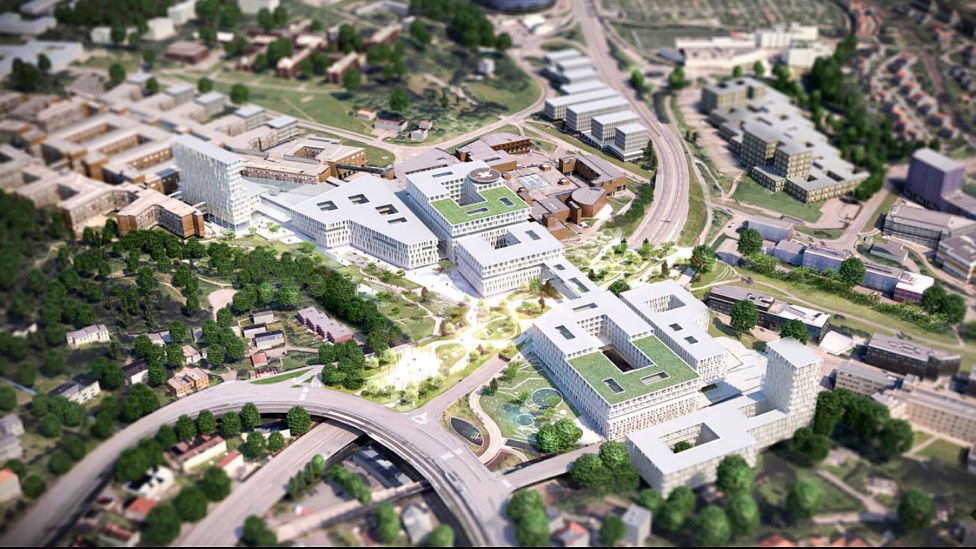 • Gigantscenario Dette er en av skissene for hvordan et nytt gigantsykehus på Gaustad kan bli seende ut om noen år. Øverst t.v. det nåværende Rikshospitalet. Da styret ved OUS i 2016 vedtok å bygge to gigantsykehus på Aker og Gaustad, ble prislappen satt til 38 milliarder kroner. Styret i Helse Sør-Øst godkjente 31. januar 2019 konseptrapporten for å videreutvikle Oslo universitetssykehus på Aker (akutt/lokalsykehus) og Gaustad (regionssykehus). I tillegg kommer et nytt spesialisert kreftsykehus på Radiumhospitalet. Planlagt gjennomføring for etappe 1 av prosjektene er 2021–2028/2029. Ill.: OSLO UNIVERSITETSSYKEHUS/NORDIC OFFICE OF ARCHITECTURE