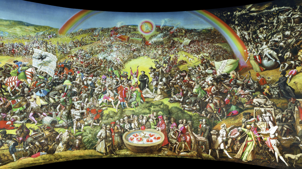 Ett sted brenner Martin Luther sin egen bannlysing. Et annet sted støtes det i Jerikos basuner. Et tredje sted ser vi representanter for håndverkslaugene sitte i en strandet båt. En bonde som henspiller på Adam etter fordrivelsen fra paradiset, bærer ikke på frø, men knokler, barnelevninger, ser det ut som. Han sår dem i en steinete fure foran en dyster undergangsvisjon.