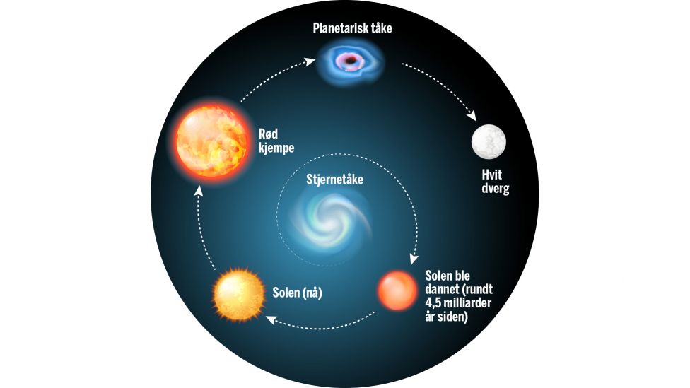 Solen er omtrent halvveis – 4,5 milliarder år – i sin forventede levetid på nær 10 milliarder år. Da vil den gå tom for sitt brennstoff, hydrogen, og kaste av seg sine ytre lag. Resten blir en varm, hvit dvergstjerne som vil avkjøles gradvis og slukne i løpet av enda noen milliarder år.